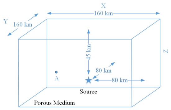 where Tc is the pulse duration; f0 is center frequency; and t is the time series. Tc and f0 were chosen to be 2.2 s and 1 Hz, respectively, and can be set to different values depending on the actual situation. Time series t is set here as 0 s~40.96 s, and the time interval is 0.02 s. Therefore, the time series has 2048 points and the sampling frequency is fs = 50 Hz. The waveform of s0(t) in the time domain is shown in Figure 2a and the frequency spectrum of s0(t) can be obtained by fast Fourier transform, which is shown in Figure 2b. The cosine pulse function is mainly distributed between 0 Hz and 2 Hz. Secondly, the physical schematic diagram of the lithosphere is presented. The lithosphere in Figure 1 is a three-dimensional space and the specific parameters in the model are plotted in Figure 3. The electrokinetic effect model can simulate the propagation of the EM wave at any position in the lithosphere. The width (X and Y axes) of the three-dimensional space is 160 km (−80 km ≤ X ≤ 80 km, 0 km ≤ Y ≤ 160 km), and the depth (Z axis) is 60 km (0 km ≤ Z ≤ 60 km). Figure 3 is a simplified model where the seismic fault consists of two layers of porous media with different parameters. The porous medium in the range of 0 km–30 km below the surface is Sandstone 1, and the porous medium in the range of 30 km–60 km below the surface is Sandstone 2. The parameters of Sandstone 1 and Sandstone 2 are shown in Table 1 [,]. The seismic source is located 45 km below the surface, and we use Equation (8) as the acoustic source function. Apparently, in real earthquakes, seismic faults are filled with spatially distributed heterogeneous irregular media with different contributions—which can be achieved in simulations by adjusting the model parameters.