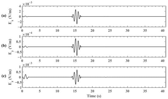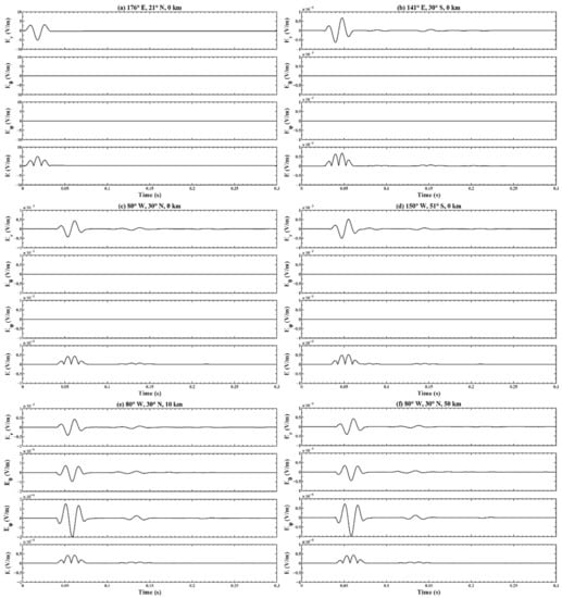 Figure 7 demonstrates the three components of the electric field and the total electric field received at six positions of the FDTD grid on the Earth–ionosphere waveguide system, in which (a) corresponds to a longitude of 176°E, a latitude of 21°N and a height of 0 km; (b) corresponds to a longitude of 141°E, a latitude of 30°S and a height of 0 km; (c) corresponds to a longitude of 80°W, a latitude of 30°N and a height of 0 km; (d) corresponds to a longitude of 150°W, a latitude of 51°S and a height of 0 km; (e) corresponds to a longitude of 80°W, a latitude of 30°N and a height of 10 km; and (f) corresponds to a longitude of 80°W, a latitude of 30°N and a height of 50 km. Figure 7a–d present the variation of the electric field in four different positions at the height of 0 km and the results are contrastively analyzed. Figure 7a is the source position from which the earthquake-induced EM wave simulated by the electrokinetic effect model was imported into the Earth–ionosphere waveguide model. Figure 7c shows that the waveform is blank before 0.04 s, which is the same as the time required for the EM wave transmitting from the epicenter to the destination at the speed of light in the medium. The first and second waves appear between 0.04 s and 0.08 s and between 0.12 s and 0.16 s, which are spread from the shorter path and longer path between the two positions on the Earth’s surface, respectively. Furthermore, Figure 7 shows the 180 phase reversals of the electric field at the second wave, which is because the phase of the EM wave will jump by 90° When it propagates through the antipode, as proven by ref. [,]. Furthermore, after the wave propagates through the observation point and travels along an entire great circle, the third disturbance appears between 0.20 s and 0.23 s, which presents the bounce of the EM wave in the Earth–ionosphere waveguide. The time difference between the first wave and the third wave is approximately 0.155 s, which is uniform with the circumnavigation period of the EM wave. The results in Figure 7b,d are roughly the same as that in Figure 7c, while the second waves appear between 0.08 s and 0.11 s. The distinction is that a new wave appears between 0.13 s and 0.16 s, and the interpretation will be analyzed in detail below.