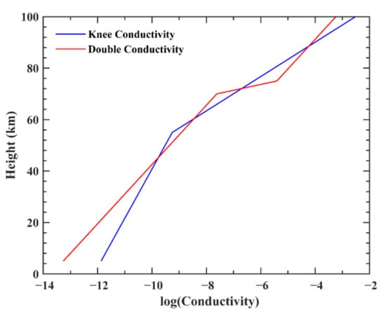 The conductivity of the knee profile and the two-exponential profile. The blue line corresponds to knee profile and the red line corresponds to the two-exponential profile.