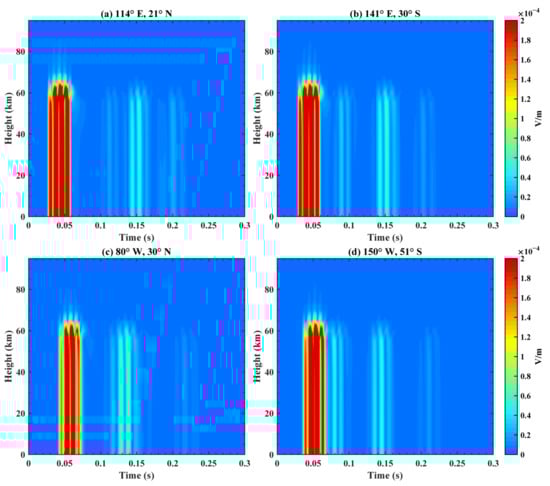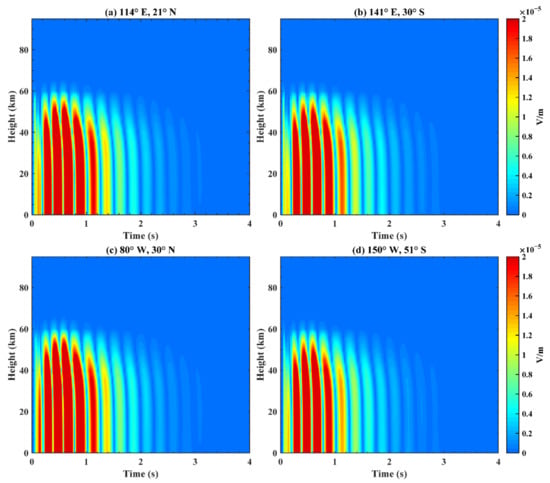 Total electric field received at different heights with time on the Earth–ionosphere waveguide model. The longitude and latitude are (a) (114°E, 21°N); (b) (141°E, 30°S); (c) (80°W, 30°N); and (d) (150°W, 51°S).