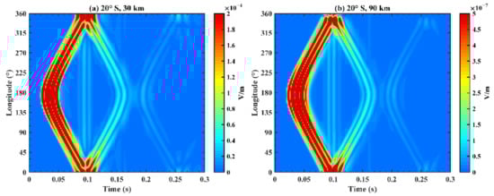 Figure 9 presents the variation of the electric field at different longitudes with time after fixing heights and the latitude position, where (a) corresponds to a height of 30 km and a latitude of 20°S; and (b) corresponds to a height of 90 km and a latitude of 20°S. The EM wave firstly appears near a longitude of 176°E at 0.02 s and then diffuses and propagates towards the west and east, as shown in Figure 9. Then, it converges for the second time near a longitude of 176°E at 0.18 s and continues its propagation process. By comparative analysis of the subfigures in Figure 9, at different heights, the diffusion and propagation processes of the electric field are approximately the same, while the amplitudes at 30 km and 90 km have approximately three orders of magnitude in difference, which is coherent with the conclusion of rapid attenuation above 60 km in Figure 8. At 0.1 s, the amplitude of the EM wave has a slight rise that covers the entire longitude and the interpretation will be analyzed in detail below.