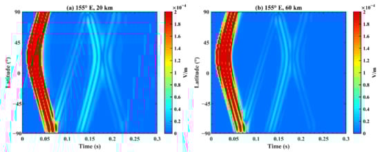 Total electric field received at different latitudes with time on the Earth–ionosphere waveguide model. The longitude and height are (a) (155°E, 20 km) and (b) (155°E, 60 km).