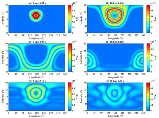 The electric field distribution on the Earth–ionosphere waveguide model at 10 km. The time is (a) 0.02 s; (b) 0.04 s; (c) 0.06 s; (d) 0.08 s; (e) 0.16 s; and (f) 0.32 s.