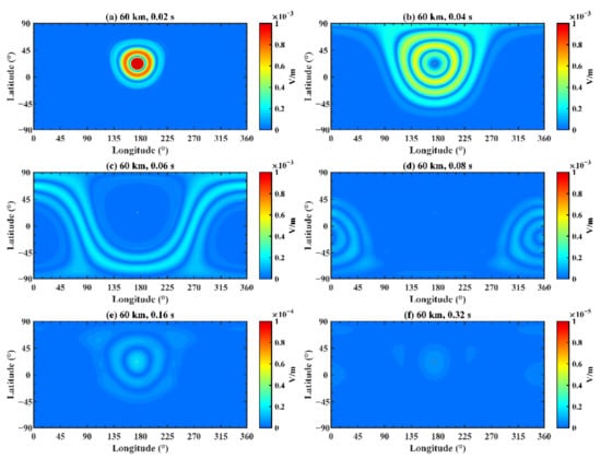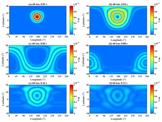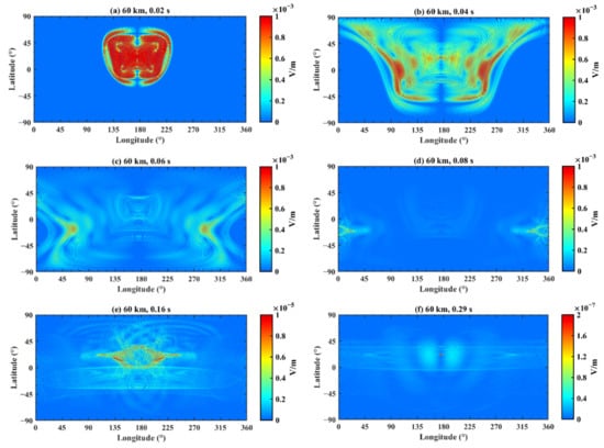 Figure 16 demonstrates the variation of the electric field at different longitudes and latitudes after fixing the times and altitude, where (a) corresponds to a time of 0.02 s and an altitude of 60 km; (b) corresponds to a time of 0.04 s and an altitude of 60 km; (c) corresponds to a time of 0.06 s and an altitude of 60 km; (d) corresponds to a time of 0.08 s and an altitude of 60 km; (e) corresponds to a time of 0.16 s and an altitude of 60 km; and (f) corresponds to a time of 0.32 s and an altitude of 60 km. Combining Figure 12 and Figure 16, it is obvious that the propagation results are similar while the amplitudes vary by several times because of the discrepancy of the conductivity profiles.