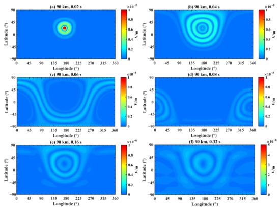 The electric field distribution on the Earth–ionosphere waveguide model at 60 km. The time is (a) 0.02 s; (b) 0.04 s; (c) 0.06 s; (d) 0.08 s; (e) 0.16 s; and (f) 0.32 s.