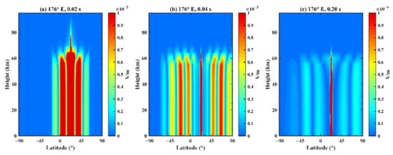 Figure 14 illustrates the variation of the electric field at different latitudes and heights after fixing the time and longitude position, where (a) corresponds to a time of 0.02 s and a longitude of 176°E; (b) corresponds to a time of 0.04 s and a longitude of 176°E; and (c) corresponds to a time of 0.20 s and a longitude of 176°E. At 0.02 s, the disturbance appears near 21°N, and then the EM wave propagates towards the north and south poles. In terms of height, Figure 14 presents an obvious attenuation of the electric field at 60 km, and the propagation range increases at 0.04 s. After transmitting around the Earth, the EM wave converges at the epicenter region again, as shown in Figure 14c.