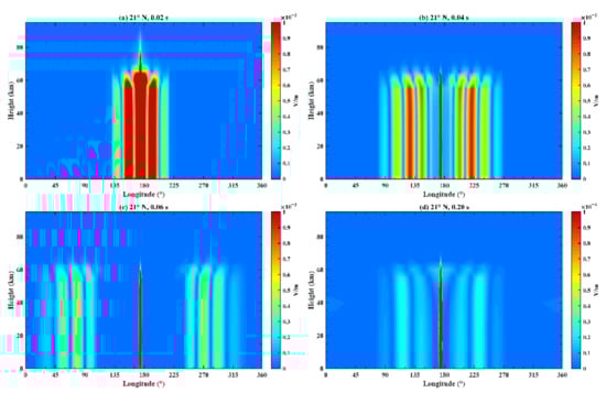 Figure 15 demonstrates the variation of the electric field at different longitudes and heights after fixing the time and latitude position, where (a) corresponds to a time of 0.02 s and a latitude of 21°N; (b) corresponds to a time of 0.04 s and a latitude of 21°N; (c) corresponds to a time of 0.06 s and a latitude of 21°N; and (d) corresponds to a time of 0.20 s and a latitude of 21°N. At 0.02 s near the initial time, the disturbance appears at approximately 176°E, and the EM wave propagates towards the west and east. In terms of height, Figure 15 shows an obvious attenuation of the electric field at 60 km and the propagation range increases at 0.04 s and 0.06 s. At 0.20 s, the EM wave transmits back to the epicenter region, therefore amplitudes around the epicenter region have large values.