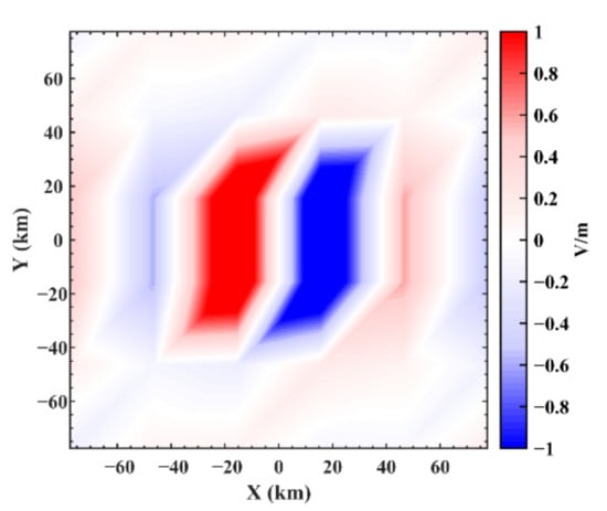 The Earth conductivity model is in knee profile, and the EM wave is located in several cells whose initial center frequency is 50 Hz and whose duration time is 0.04 s. We modified the Earth–ionosphere waveguide model in Section 3, including by dividing the radial grid into 5, the meridional grid into 1280, the zonal grid into 640 and selecting an appropriate time step to meet the stability conditions of the model. The EM wave was input into the Earth–ionosphere waveguide model at the altitude of 0 km, longitude of 174.3–177.1°E and latitude of 19.3–22.1°N. Since the range of the electrokinetic effect model on the surface is 160 km × 160 km and the resolution of the Earth–ionosphere model is approximately 30 km × 30 km, the simulation result of electrokinetic effect is constituted of 5 × 5 grids. At every grid, the ELF electric field results are similar to those in Figure 6a. Based on the electrokinetic coseismic effect model, the EM wave at the surface (x = −80 km–80 km, y = −80 km–80 km, z = 0 km) is calculated and the result at initial time is shown in Figure 17. Thus, we obtain the simulation result of 5 (0 ≤ r ≤ 80 km) × 640 (−π/2 ≤ θ ≤ π/2) × 1280 (−π ≤ φ ≤ π) cells on the three-dimensional sphere of the Earth with time varying from 0 s to 0.4 s. The resolutions are Δr = 20, Δθ = π/640 and Δφ = 2π/1280.