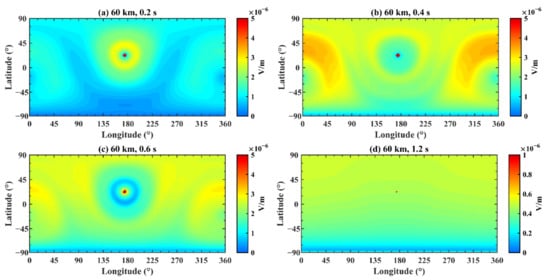 The electric field distribution on the Earth–ionosphere waveguide model at 60 km. The time is (a) 0.2 s; (b) 0.4 s; (c) 0.6 s; and (d) 1.2 s.