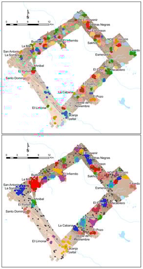 The center of La Mar, encompassing that capital’s public architecture and a relatively tight cluster of residential buildings established using HDBSCAN (min 10), encompasses 97 structures in ~0.3 km2 (237 str/km2). Despite its small core, La Mar was the nexus for a sizable surrounding peri-urban settlement of 571 structures in ~5.6 km, or 101.8 str/km2, significantly denser than the peri-urban settlement associated with Piedras Negras. The rugged hills of the Sierra Guiral to the west of La Mar likely influenced the gap of more than 2 km between La Mar and the next settlement cluster at San Antonio La Sombra. To the northwest of La Mar, evident gaps between settlement clusters are small, with settlement essentially continuous as far as Budsilha, except where wetlands precluded construction. We also know from ground survey that apparent absences beneath the modern towns of Agua Cristalina and Nueva Esperanza Progresista obscure ancient settlement. To the northwest of Budsilha, settlement clusters become more widely scattered among the hills approaching the Usumacinta River.