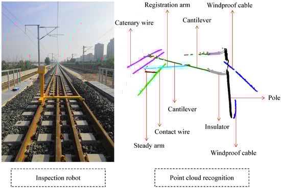 Recently, as a noncontact measuring method, light detection and ranging (LiDAR) emits laser beams and measures the distances from LiDAR to object points in various scenarios. In addition, LiDAR measures the strength of the return. LiDAR is widely applied in diverse fields such as three-dimensional (3D) object recognition [], cultural heritage representation [], and OCS recognition [], due to its high accuracy, reliability, and efficiency. Through LiDAR, OCS components are scanned, and then, their point clouds are generated. Based on point cloud segmentation, the OCS is recognized for railway system inspection. Figure 1 shows that individual components of an OCS can be segmented from LiDAR point clouds. Additionally, LiDAR is not affected by extraneous obstacles such as trees in high-speed railway scenarios, as the obstacles are strictly restricted to places far from an OCS. In sum, LiDAR has several advantages for OCS recognition: