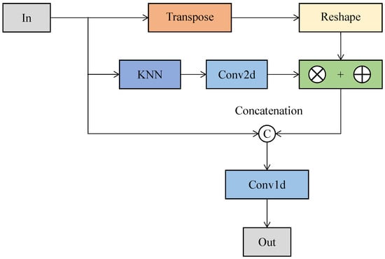 ExtractA module: Based on the first principle, we developed the ExtractA module to extract effective features, inspired by Lin et al. []. ExtractA solves the issues of the disorder and irregularity in point clouds. In Figure 2, the operations of reshape and transpose are to change feature dimensions; the ⨂ is the operation of point multiplication; the ⨁ is the summation operation. We constructed a local area with each point and j = , relying on KNN. The construction process is as follows: