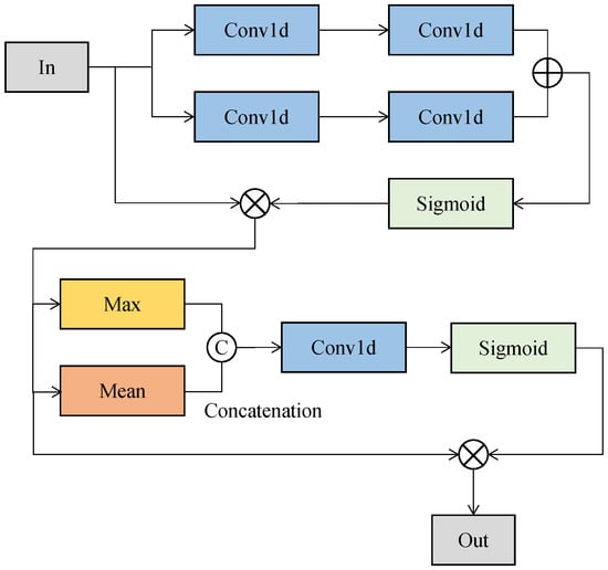 where i is the spatial index of L; L is the spatial dimension of 1D features; , ; denotes the set of all 2D real numbers; N is the number of input channels; Y is the number of groups after we group the feature map along the channel dimension; M has Y groups, which have been divided two branches and ; is the operation of global averaging pooling; is a channelwise statistic, and . The output of channel attention is calculated as: