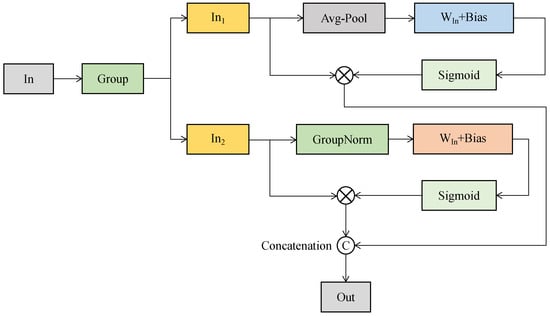 To acquire spatialwise statistics, we employed group normalization to process the branch . The outputs of group normalization were used as the inputs of a parameter function. The purpose of the parameter function is spatial attention extraction. To refine the features, we adopted the outputs of the parameter function as the inputs of a sigmoid function. The values from the sigmoid function and the outputs of the branch were also multiplied for the broadcast of channel attention values. With these steps, the interspatial relationship was explored. Then, we concatenated the outputs of the upper and lower parts of Figure 4 for information fusion.