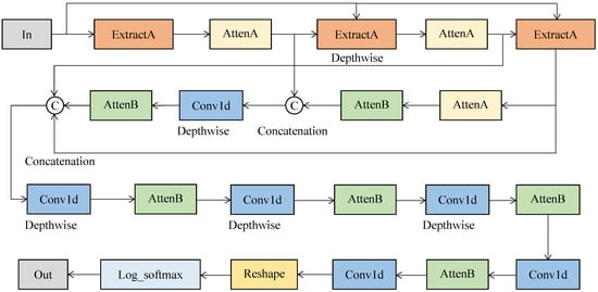 where and are the parameters with size ; is a sigmoid function; G is the group normalization operation []. Then, and are aggregated to communicate information among subfeatures. The above three principles are respectively achieved through three modules: ExtractA, AttenA, and AttenB. We describe the implementation of these principles in detail as follows: