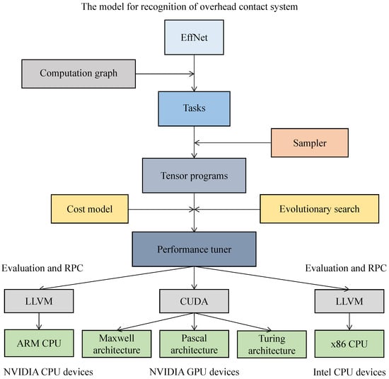 In each iteration, the performance of the tensor programs was measured on different architectures with an RPC tuning framework. We employed the platform RTX 2080 Ti GPU as a host. The host sent the batches of sampled tensor programs to different embedded devices with diverse architectures for execution. The execution time of EffNet on embedded devices was measured. The embedded devices returned the execution latency to the host, and the performance of the current program configuration parameters was evaluated on the host. Specifically, the host uses the measured performance results as inputs, trains the cost model, and executes reproduction, crossover, and mutation for configuration parameters using evolutionary search. Our model was adapted to the Pascal, Turing, or Maxwell architectures by CUDA and the ARM or x86 CPU architectures by LLVM. Then, a new tensor program with potentially higher quality was generated. Through multiple iterations of trials, we could obtain the best-performing tensor program, which refers to the program with the least latency. The best-performing tensor program was sent to embedded devices. Through the above process, we obtained the overall minimum latency of EffNet on embedded devices with different architectures.