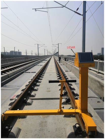 The robot controlled the start and end of measurement by embedded devices such as Jetson TX2. The walking speed of the robot carrying the LiDAR device was 1 m/s. While moving over rails, the robot used an odometer to continuously record the displacement of the LiDAR sensor. An odometer is relatively stable compared with a global navigation satellite system (GNSS) positioning device. In detail, when the robot carrying an odometer passes through tunnels, the odometer can still record the displacement. On the contrary, the signal of a GNSS positioning device is easily blocked in tunnels. Then, the displacement may not be recorded accurately by the GNSS positioning device in tunnels. In addition, GNSS positioning devices are extremely susceptible to electromagnetic interference. Therefore, we employed an odometer to record the displacement of the LiDAR device along the rails.