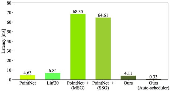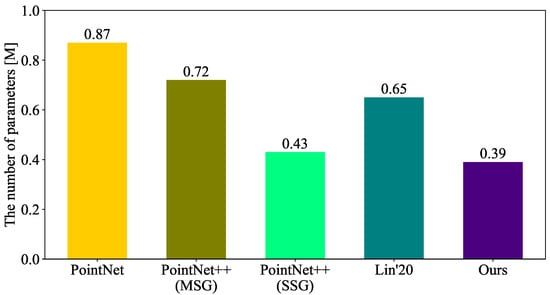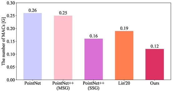 Evaluating the number of MACs: As shown in Figure 9, to measure the computational complexity of the models, we calculated the number of MACs. In the figure, “[G]” represents . For a fair comparison, 300 point cloud points were employed as the inputs of all methods in this figure. The comparison showed that our computational complexity is lower than that of other studies. For instance, our MACs are 36.84% fewer than those of the recent work []. Our MACs are also 53.85% fewer than those of the classic method []. In short, compared with other similar methods, the MACs of EffNet are fewer, that is our computational complexity is low, and EffNet is lightweight. The optimization of EffNet does not change the computational complexity, but reduces the latency. The latency of EffNet was further evaluated on different platforms as follows.