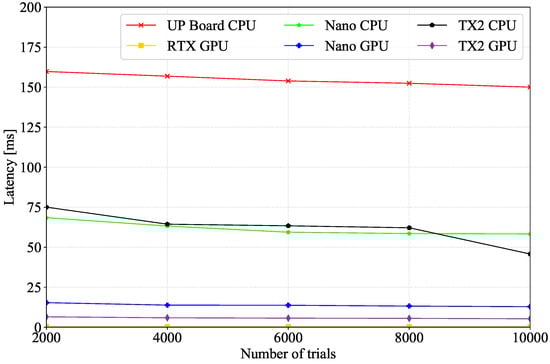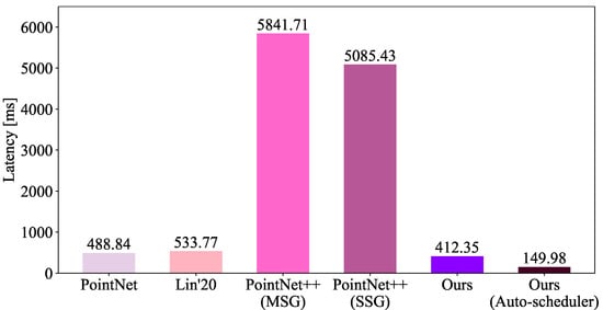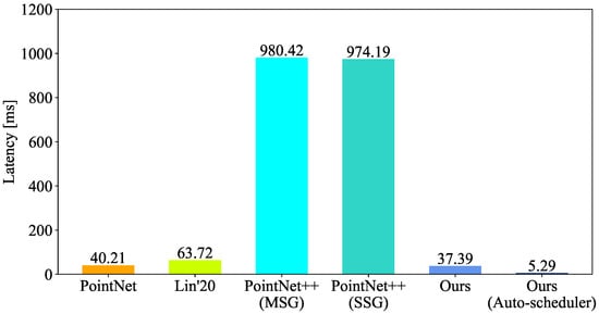 Evaluating the latency on the RTX GPU: As shown in Figure 10, our latency was compared with the state-of-the-art on the RTX 2080 Ti GPU. The comparison methods were implemented, and their latency was measured. In this figure, “Ours” and “Ours (Auto-scheduler)”, respectively, represent the latency of the original and optimized EffNet networks on the RTX 2080 Ti GPU. The inputs of all models were 1000 point cloud points. The dimension of each point was three. The unit of latency was milliseconds. The following comparison was also set up the same as this. Before optimizing EffNet, we have at least 93.64% less latency than the work []. The latency of the original EffNet is at least 11.23% lower than other methods [,]. When optimizing EffNet, we set the maximum number of trials to 10,000 on the RTX 2080 Ti GPU. We used the latency corresponding to the maximum number of tuning. After optimization, EffNet decreases the latency by 91.97%, while its accuracy is the same as before optimization on the RTX GPU. The latency of the optimized EffNet is at least an order of magnitude lower than similar recognition methods. Then, we evaluated the latency of EffNet before and after its optimization on embedded devices with different architectures.