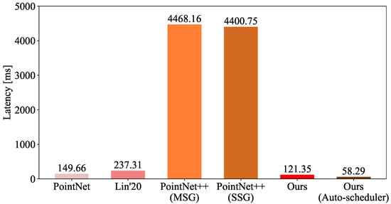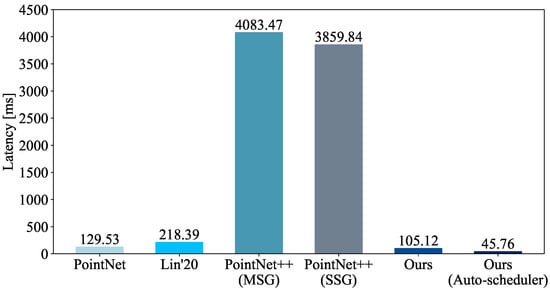 Evaluating the latency on the TX2 GPU: We compared the latency of the original and optimized EffNet networks with the state-of-the-art on the TX2 GPU. As depicted in Figure 11, “Ours (Auto-scheduler)” and “Ours”, respectively, represent the latency of the optimized and original EffNet on the TX2 GPU. The same expression is used in the following figures, which show the comparison on other embedded devices. The maximum number of trials was set to 10,000 for optimization on the TX2 GPU and the following embedded devices. We adopted the latency corresponding to the maximum number of tuning. The optimized EffNet has at least 99.46% lower latency than the prevalent PointNet++ (MSG) or (SSG). Compared with other similar studies in the figure, the optimized EffNet has at least 86.84% less latency. The optimized EffNet reduces the latency by 85.85%, while its accuracy is the same as before optimization on the TX2 GPU. Compared with the others, the latency of the optimized EffNet is an order of magnitude less. Therefore, the optimized EffNet is efficient whether on the TX2 GPU or RTX GPU. We evaluated the latency on other embedded architectures below.