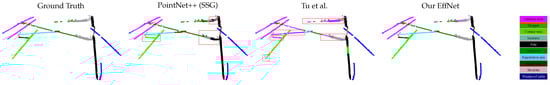 The precision/IoU in each category and mean accuracy of EffNet were compared with those of the state-of-the-art, as listed in Table 1. Here, the best results are in bold; PointNet++ (MSG) or (SSG), respectively, refer to PointNet++ with multiscale grouping (MSG) or single-scale grouping (SSG). For a fair comparison, the neighboring points of the KNN were set to be the same as those of the latest work [,]. Our method outperformed others on multiple categories of OCS recognition. Specifically, our precision was slightly higher than that of [] in the categories of the steady arm, cantilever, pole, registration arm, dropper, insulator, contact wire, and catenary wire. Our IoU was respectively at least 3.22%, 0.05%, 3.10%, 1.89%, 2.01%, and 0.23% higher than that of the research [] in the categories of the steady arm, pole, cantilever, registration arm, insulator, and catenary wire. Our mean accuracy of IoU was also at least 1.13% higher than that of other methods. In summary, our methods had the best accuracy for OCS recognition.
