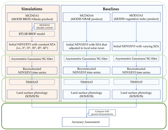 The process chain of deriving LSP from simulations with constant SZAs and from baseline products with inconsistent SZAs. The green rectangles from top to the bottom represent NDVI/EVI time series simulation based on the kernel-driven model, NDVI/EVI time series reconstruction, land surface phenology derivation, and accuracy assessment, respectively. Blue solid rectangles are used products or derived results, while blue dashed rectangles are used models or integrated algorithms.