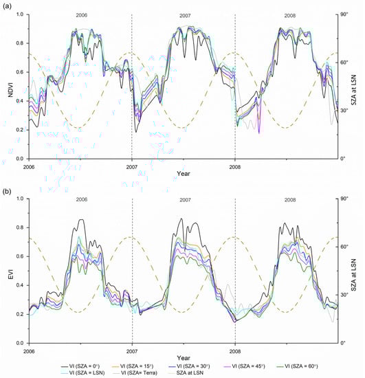 The NDVI and EVI time series show an opposite pattern with increasing SZA: the larger the SZA, the higher the NDVI profiles, but the lower the EVI profiles. This result aligns well with previous studies [34,38]. The increase of SZA results in decreased reflectance in both red and near-infrared bands, but NDVI increases at large SZA because of a greater decrease in the red than in the near-infrared [103,104,105], while EVI decreases at large SZA because of greater NIR dependence [106,107,108]. In addition, the sensitivities of NDVI and EVI to varying SZAs are different. Specifically, EVI is more sensitive to varying SZAs than NDVI, especially in growing seasons, where the NDVI profiles are less scattered than the EVI profiles. The stronger sensitivity of EVI to varying SZAs echoes previous research conducted by Galvão et al. (2011). They compared 10 narrowband vegetation indices in terms of their sensitivity to view-illumination effects and found EVI was more anisotropic than NDVI. They also found shade fraction was negatively related to EVI. In this study, both view zenith angle and relative azimuth angle are set to 0, so shade fraction increases with the increase of SZA. Therefore, EVI decreases with the increase of SZA (Figure 2b).