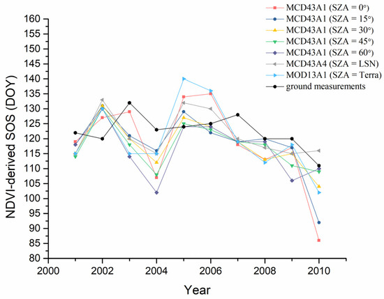 SOS derived from the NDVI time series from 2001 to 2010. SZA = 0°, 15°, 30°, 45° and 60° denote the SOSs derived from the MCD43A1 (BRDF) product with a consistent angle configuration; SZA = LSN and SZA = Terra refer to SOSs derived from the MCD43A4 (NBAR) product and the MOD13A1 (VI) product, respectively.