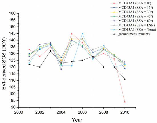SOS derived from the EVI time series from 2001 to 2010. SZA = 0°, 15°, 30°, 45° and 60° denote the SOSs derived from the MCD43A1 (BRDF) product with a consistent angle configuration; SZA = LSN and SZA = Terra refer to SOSs derived from the MCD43A4 (NBAR) product and the MOD13A1 (VI) product, respectively.