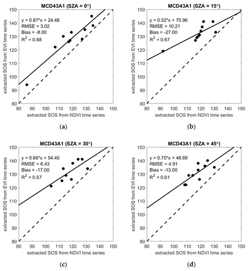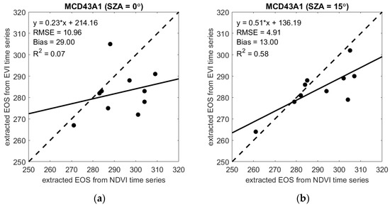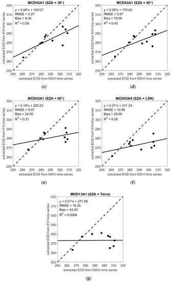 A comparison between NDVI-derived EOSs and EVI-derived EOSs is shown in Figure 8, with a poor correlation compared to VI-derived SOSs. When the SZA is within the range from 15° to 45°, 0.45 < R2 < 0.58, and when the SZA is 0° and 60°, R2 is 0.07 and 0.21, respectively. The R2 between retrieved EOSs from the MOD13 (VI) NDVI and the EVI time series is only 0.0004, indicating a compromised consistency. Additionally, the distribution of points is located below the diagonal, which indicates that EOSs derived from EVI are generally earlier than those derived from NDVI.