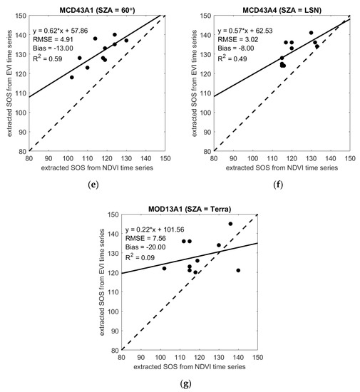 Comparisons of the SOSs derived from the NDVI and EVI time series from 2001 to 2010 are shown in Figure 5. The x-axis represents the NDVI-derived SOS, and the y-axis indicates the EVI-derived SOS. The SOSs derived from MCD43A1 (BRDF) product are distributed along the diagonal and exhibit a higher correlation (0.57 < R2 < 0.88), indicating that the NDVI-derived SOSs and EVI-derived SOSs under a constant SZA are relatively close; the SOSs derived from the MCD43A4 (NBAR) and MOD13A1 (VI) products show a relatively low correlation, with an R2 of 0.49 for the former and only 0.09 for the latter. In addition, the distribution of points occurs mainly above the diagonal line, suggesting that EVI-derived SOSs generally occur later than NDVI-derived SOSs.