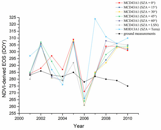 In contrast with NDVI-derived SOS, NDVI-derived EOS generally overestimates the EOS relative to that of the ground measurements, excluding 2006. From Table 4, the NDVI-derived EOS shows a large RMSE when the SZA equals 60°, indicating a poor performance of the simulated NDVI time series in deriving EOS under a large SZA. Compared to the rank correlation between NDVI-derived SOSs and ground-measured SOSs (Table 2), the rank correlation between NDVI-derived EOSs and ground-measured EOSs is low (Table 4), aligning well with the pattern shown in Figure 6, where the trend of ground-measured EOS over ten years shows less variation, yet the NDVI-derived EOS demonstrates drastic variation throughout the evaluated years.