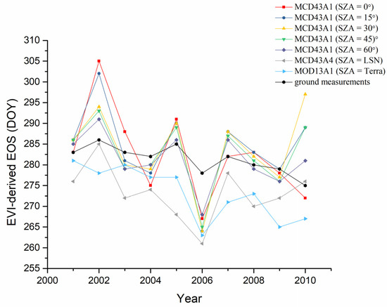 EOS derived from the EVI time series from 2001 to 2010. SZA = 0°, 15°, 30°, 45° and 60° denote the EOSs derived from the MCD43A1 (BRDF) product with a consistent angle configuration; SZA = LSN and SZA = Terra refer to EOSs derived from the MCD43A4 (NBAR) product and the MOD13A1 (VI) product, respectively.