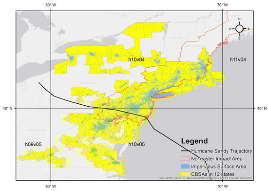Hurricane Sandy (2012), also called Superstorm Sandy, was formed in the western Caribbean Sea on 22 October, made its landfall near Atlantic City in New Jersey in the United States on 29 October, and finally dissipated on 2 November. Hurricane Sandy impacted the Northeastern United States with heavy rain and strong winds and later caused flash flooding and storm surge consequently. In total, 233 people were dead across eight countries from the Caribbean to Canada and over 650,000 homes were damaged in the US []. Moreover, Hurricane Sandy caused around 68.7 billion worth of damage, which heavily impacted the economy in the Northeastern US. According to the Hazus disaster damage model from the Federal Emergency Management Agency (FEMA), 12 states were heavily impacted by Hurricane Sandy, including New York, Connecticut, New Jersey, Delaware, District of Columbia, Maryland, Massachusetts, New Hampshire, Pennsylvania, Rhode Island, Virginia, and West Virginia []. To capture human dynamics in populated areas, 66 Core-Based Statistical Areas (CBSAs) within 12 states, including both metropolitan and micropolitan statistical areas, are selected as the study area (yellow areas in Figure 1) (CBSA data can be downloaded from the US Census []). According to 2010 American Community Survey (2012ACS 5-year estimates) and Bureau of Economic Analysis (BEA) data, the study area has a 19.7% of the US total population (60,876,820 out of 308,745,538) and contributes 28.7% of the Gross Domestic Product generated in the US in 2012 ($4,107,550,656,000 out of $14,332,171,020,000). Within these 66 CBSAs, 52.3 million people (86.0% of the total population) lived in coastal areas. The population in the study area consists of 69.0% White, 16.1% African American, and 6.2% Asian. The research area has 5 of the 25 largest urbanized areas in the US, including Washington D.C., Philadelphia, New York City, Boston, and Baltimore []. In summary, the study area is one of the most urbanized regions in the US and it is of utmost importance to analyze how a well-developed region responds and recovers from one of the costliest Atlantic hurricanes in US history. Four SNPP-VIIRS DNB tiles (h09v05, h10v04, h10v05, and h11v04) that fully cover the study area were utilized to analyze NTL radiance changes. The spatial analysis of NTL radiance has been conducted in pixels, block groups, and CBSAs to avoid the Modifiable Areal Unit Problem (MAUP).