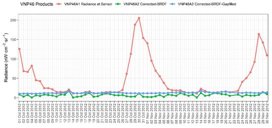 The NTL radiance data were extracted from the compressed Black Marble images in Hierarchical Data Format (HDF5) using R. The BRDF-corrected radiance (in VNP46A1 products), BRDF-corrected gap-filled radiance (VNP46A2), and non-corrected radiance at sensor (in both VNP46A1 and VNP46A2) were compared in Figure 2. The result shows that the corrected radiance (VNP46A2 & VNP46A2 gap-filled) has a more stable daily NTL radiance compared with the original radiance (VNP46A1) that is fluctuated due to moonlight cycles (Figure 2). The UTC_Time layer in the VNP46A1 products contains the UTC time when nighttime radiance is acquired. Four types of QA values in the VNP46A2 products indicate the quality of pixels: value 00 denotes high-quality persistent NTL, value 01 means high-quality ephemeral NTL, value 02 is poor quality (outlier, potential cloud contamination, or other issues), and value 255 is no retrieval (VNP46A2 gap-filled layer applies high-quality pixels from the nearest date to replace no-retrieval pixels) [,]. To ensure high-quality and consistent NTL radiance, this study only used high-quality pixels (value 00) in the non-filled images (VNP46A2) and excluded pixels in the other quality levels (01, 02, and 255). Daily NTL images of the research area that are collected by a single scan and mainly covered by high-quality pixels were used. Then the qualified daily NTL images were mosaiced in R and later cropped into different spatial units (e.g., block groups, CBSAs, etc.) for spatial and explanatory analysis.