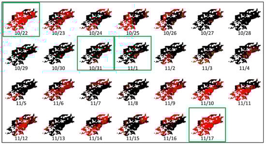 High-quality pixel coverage during Hurricane Sandy (2012) in the northeastern United States, where the red color indicates high-quality pixels, the black background is the study area (i.e., 66 CBSAs in the Northeastern US), and the green boxes indicate dates selected.