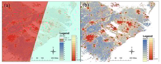 Combining the two criteria, 22 October was selected as the sampling time point in the pre-disaster period. 17 November was selected as the sampling point in the post-disaster period with additional considerations. First, dates between 6 November and 10 November were excluded from the selection to eliminate impacts from the 2012 Nor’easter Storm. 12 November meets both criteria but does not cover the populated areas (e.g., New York City) near the landfall location, and thus was not selected. Due to the thick cloud brought by the hurricane, it has been a challenge to find a single image meeting both criteria during the in-disaster period. Thus, the two images on 31 October and 1 November were combined to create a larger spatial coverage. When combining the images, if a pixel had a high-quality flag on both days, the average NTL radiance of the two days was assigned in the combined image. If a pixel had a good QA value in one of the two days, the NTL radiance on that day was selected. Pixels with poor QA values on both days were excluded from the analysis.