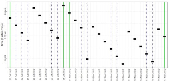 The acquisition time of NTL during Hurricane Sandy (2012) in the Northeastern United States. Blue dashed lines indicate dates with dual acquisition time. Green lines indicate dates with single acquisition time, which were used to represent pre-, in-, and post-disaster periods.