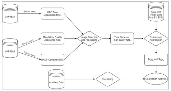 Finally, results from all univariate regression models at different research scales are summarized in the table. The coefficients of these models (e.g., p-value, R2) are reported to indicate the significance of the relationships. Variables with high correlation with and are highlighted. The potential driving factors of these significant correlations with the NTL change are discussed. The workflow of the entire analysis process is summarized in Figure 7.