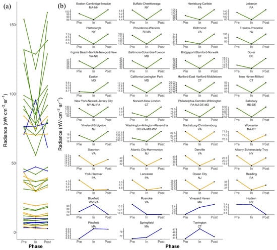 NTL radiance changes in 39 CBSAs in the Northeastern United States in the pre-, in-, and post-disaster periods: (a) NTL changes in a single plot (same scale in the y-axis); (b) NTL changes are shown in separate plots (different scales in the y-axis), CBSA name and state abbreviation is attached to the header of each plot to the right.