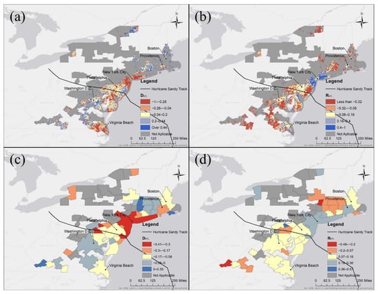 The spatial patterns of and are shown at the pixel and CBSA levels in Figure 9. At the pixel level (Figure 9a,b), the New York/New Jersey Bight area has a large NTL disturbance (high absolute value of , red color) in the hurricane and a strong recovery after the hurricane (high ). This area is highly populated and close to the landfall location of Hurricane Sandy. As an exception, the center of New York City only had moderate NTL disturbance and recovery. Additionally, NTL disturbance can also be observed in Providence, Virginia Beach. At the CBSA level (Figure 9c,d), the metropolitan areas near New York City and Providence had a large NTL reduction (high absolute ), but the NTL in most areas soon recovered from the reduction (high ). Regions near Providence, Philadelphia, New York, Washington D.C., have recovered to the pre-disaster condition and can be considered resilient from this perspective. Several inland areas, such as Lancaster and York-Hannover CBSA in Pennsylvania, experienced NTL reduction and did not recover to their pre-disaster condition. As can be observed in Figure 9, the NTL disturbance shows different spatial patterns when aggregated in different spatial units. For example, areas near Virginia Beach had a large NTL reduction at the pixel level but had a small reduction at CBSA level. The variation in different spatial levels demonstrates the MAUP when analyzing the NTL changes.
