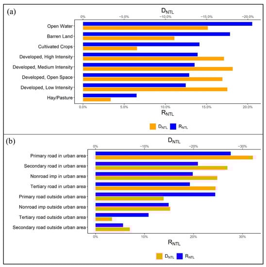 Finally, NTL metrics ( and ) were compared among different LULC types. Figure 10a shows that non-urban land cover types (open water, barren lands, cultivated crops) have a large radiance reduction (large absolute value of ) and relatively slow recovery (lower ). Urban areas, including high-, medium-, and low-intensity developed land, and open space had relatively small radiance reduction (small absolute ) but faster recovery (higher ). Among the four urban land uses, high-intensity developed area had the largest NTL reduction (largest absolute ) in the hurricane. In different imperviousness surfaces, primary and secondary roads had large radiance reduction (large absolute ) which may be caused by interrupted traffic (Figure 10b). The recovery rate of primary roads in urban areas is higher than primary roads in non-urban areas. Tertiary and secondary roads outside urban areas had little fluctuations (low absolute and low ). In general, roads within urban areas have shown a strong post-disaster recovery, while roads in rural areas take longer to recover.