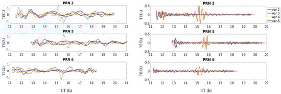 Observations of PRN 2, 5, and 6 at the HKWS station from 11:00 to 21:00 on 2–5 April 2019. The left panel indicates the disturbance and the right panel indicates the ionospheric GW. The three subplots indicate PRN 2, 5, and 6. The colors of the lines represent different dates: blue for 2 April, red for 3 April, yellow for 4 April, and purple for 5 April.