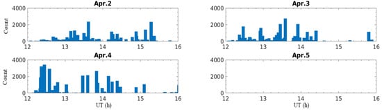 To explore whether the observations are triggered by a thunderstorm, the number of lightning events at 12–16 h from 2–5 April are used as a reference, as shown in Figure 2.
