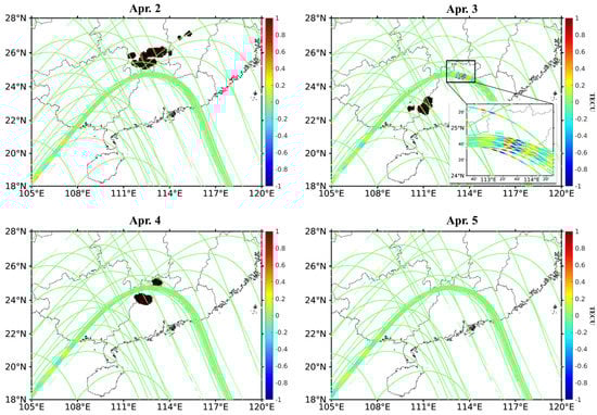 To further investigate the spatial location relationship between ionospheric GWs and lightning, the map of lightning position using LMI data is shown in Figure 3. The GWs observed on April 3 are located directly north of Hong Kong and Shenzhen, as shown in the upper right subplot of Figure 3. GWs are not observed in the same area on other days. Around Vietnam and Laos (about 105°E, 18°N), located on the southwest of China, there are longer period waves in days with and without thunderstorms.