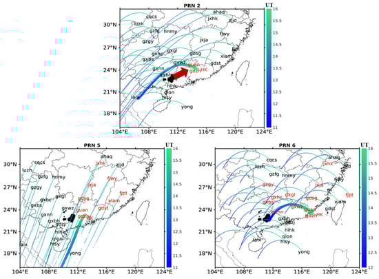 Trajectories of the satellite IPP of PRN 2, 5, and 6 from 14 h to 17 h on 3 April 2019. The color axis represents universal time. The black patches are thunderstorm areas. Hong Kong’s dense stations are represented by ‘HK’. The names of disturbed stations before and around 16 h are marked in red.
