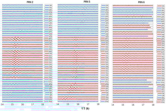 For the magnitude of GWs, Erin et al. [,] and Rahmani et al. [] use 0.08 TECU as the threshold, which is also used in this paper for the 6–16 min perturbation. In Figure 5 and Figure 9, PRN 6 has the smallest perturbation magnitude; however, it reaches 0.3 TECU, which exceeds the threshold of 0.08 TECU [] and can therefore be judged as a GW perturbation.