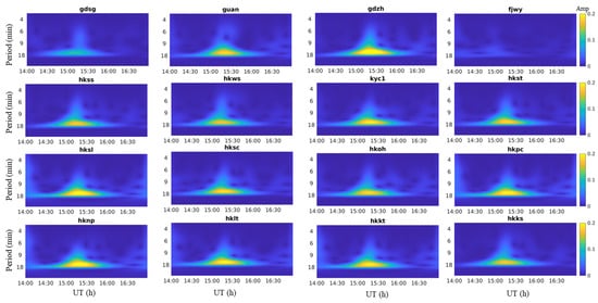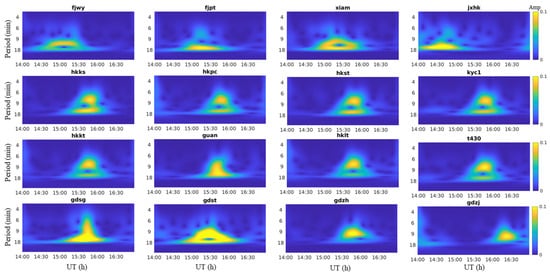 The propagation period is a primary property of GWs. Figure 6 and Figure 7 show the period characteristics obtained using the S transform [,]. The occasion of perturbation observed by PRN 2 is around 15:00 for most stations, which is consistent with the left panel of Figure 5. The frequency of the disturbances is 1–2 mHz, corresponding to a period of 8.3–16.7 min, which is exactly the range of GWs induced by thunderstorms [].