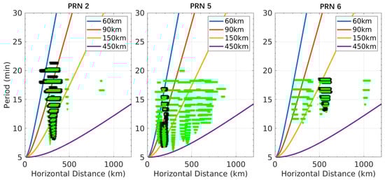 In comparison with PRN 2 and PRN 6, PRN 5 observes this disturbance from a wider length range. In the range of horizontal propagation distance less than 500 km, the disturbances have periods of 6–20 min. When the distance is greater than 500 km, only disturbances with a period of 10 min or more are observed. The disturbances are present in almost the entire region from the D to F layers. The purple line of the PRN5 subplot of Figure 8, enveloping the measured values, indicates the variation of the shortest period with horizontal distance. The envelope line is located between 150 km and 450 km of ionospheric altitude. By the black and green scatters and the four solid lines, it can be inferred that the higher the region where the ionospheric GWs exist, the longer the period. The GNSS measurements show that there are longer periods of GWs with the increase of propagation distance, which is consistent with the propagation theory of GW.