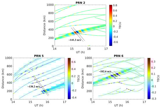 In Figure 9, the wave peaks or troughs on the IPP at different stations are fitted linearly. The slope of the fitted line is the propagation speed of the GWs [,]. For instance, 141.3 m/s is measured by PRN 2, 138.2 m/s by PRN 5, and 102.6 m/s by PRN 6, as shown in Figure 9. The disturbance observed by PRN 2 is during 15:00–16:00 and propagates at a distance of 200–400 km. During the same period, the disturbances observed by PRN 6 are located at a propagation distance of 600 km, which means that the IPP of PRN 6 is further from the source of the thunderstorms at this time slot. This indicates more than one type of GWs generated by the thunderstorms and the different IPP distances observing the waves with different wave propagation speeds.